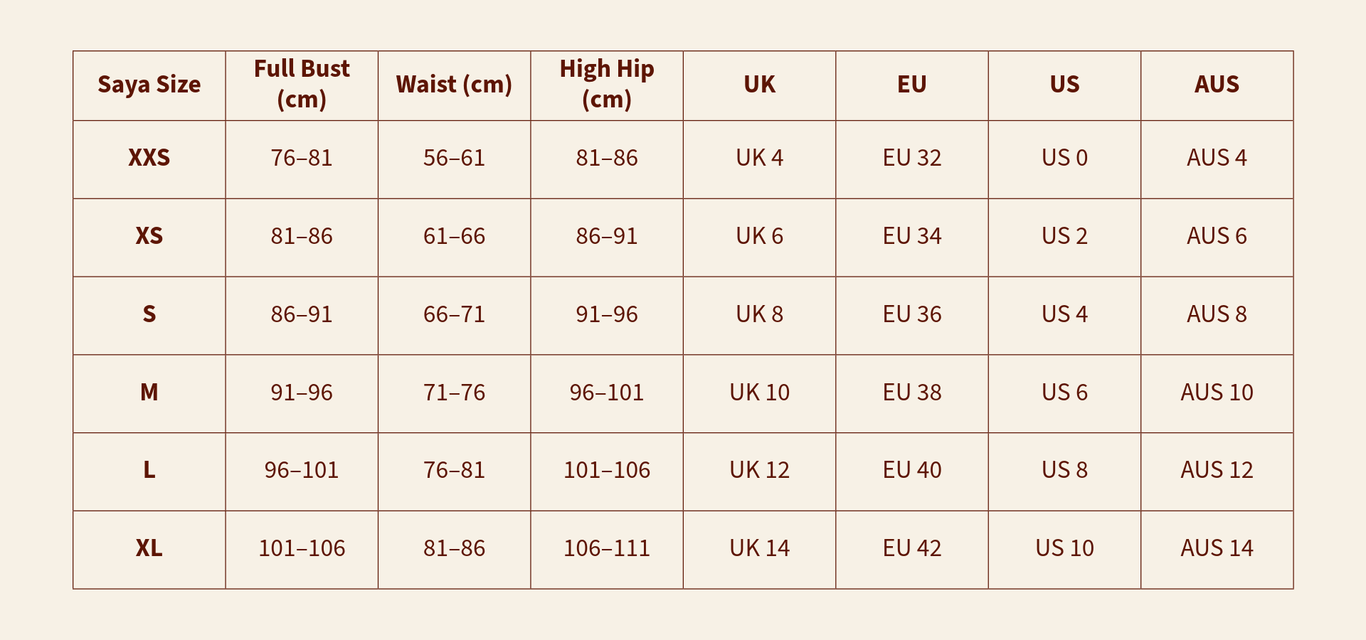 Find your perfect fit with our comprehensive sizing chart. Our sizing follows standard international swimwear measurements. Our garment sizing is consistent and true to size. If you need help choosing your size, feel free to contact us.